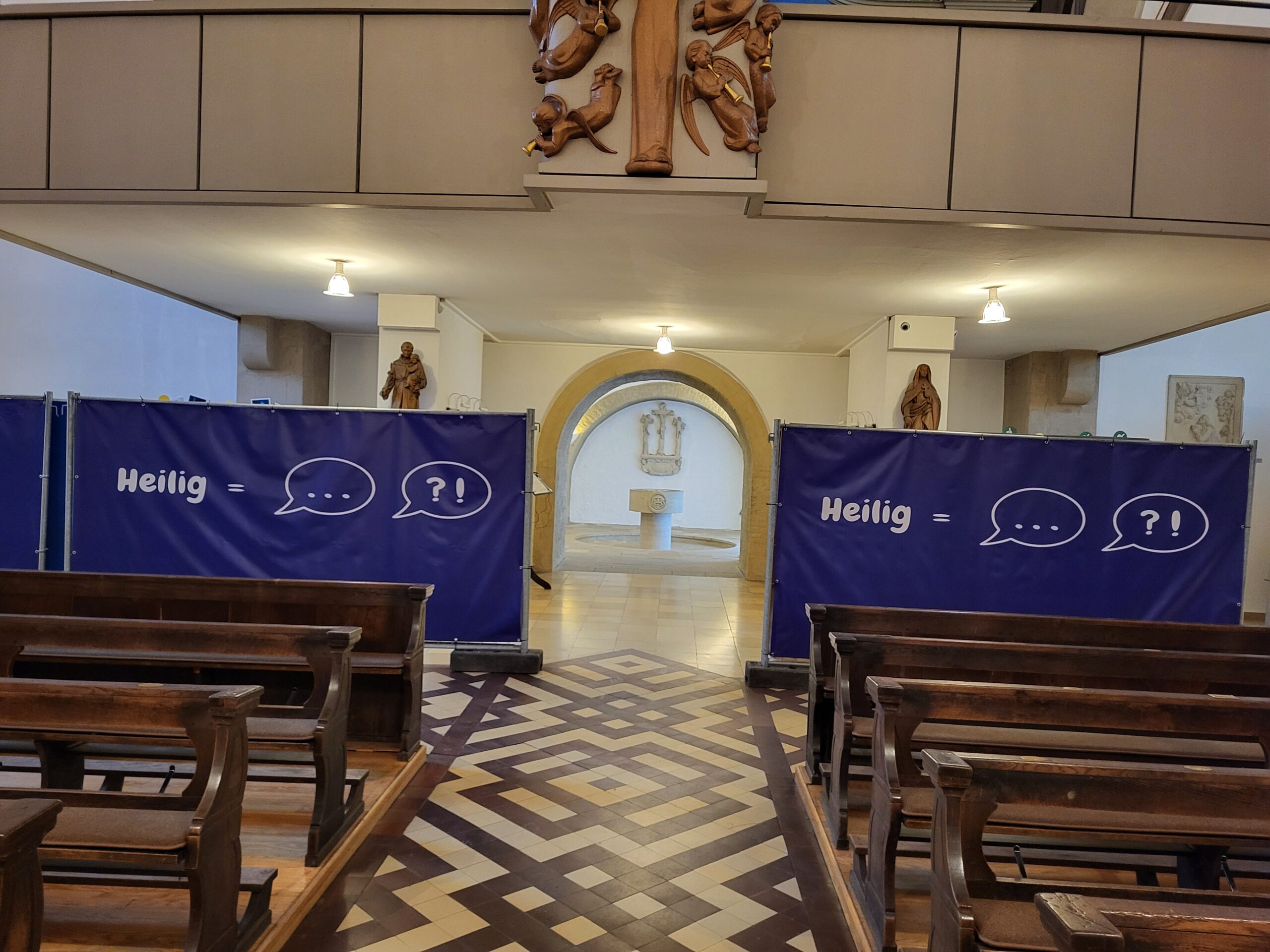 Neue Ansätze, verschieden Betrachtungsweisen und einige Überraschungen verspricht das Pastoralteam allen, die sich mit dem Thema „Heilig“ hier auseinandersetzen, so die Pfarrgemeinde in ihrer Pressemitteilung. Neben traditionellen religiösen Fragestellungen, Beispielen und Erklärungen werden mehrfach die eigenen persönlichen Lebensweisen hinterfragt, eigene Wertevorstellungen reflektiert und Erkenntnisse ansprechend bildhaft präsentiert. Große Bauzaun-Elemente dienen als Ausstellungsfläche und geben der Fläche die notwendige Struktur innerhalb des Gotteshauses, nahe des Marktplatzes.