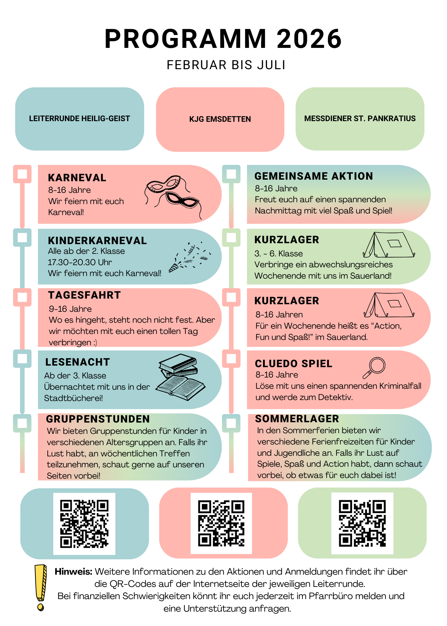 Wir sind eine Gruppe aus vielen verschiedenen Persönlichkeiten, die sich dazu entschlossen haben, in der Jugendarbeit tätig zu werden. Jugendarbeit bedeutet für uns, ins Lager zu fahren, Aktionen zu veranstalten, Messdiener zu sein, Gruppenstunden zu gestalten und vor allem Spaß dabei zu haben. Aktionen wie Karneval, eine Lesenacht in der Bücherei, das Plätzchenbacken zu Weihnachten und noch vieles mehr stehen in jedem Jahr an. Bei diesen Aktionen können Kinder und Jugendliche im Alter von 8 bis 16 Jahren mitmachen. Wir als Leiterrunde veranstalten jedoch nicht nur eigene Aktionen, sondern sind auch in allgemeinen Veranstaltungen der Gemeinde Heilig-Geist eingebunden. Dazu gehören zum Beispiel das Pfarrfest, Gottesdienste (besonders zur Osterzeit) oder auch die Sternsingeraktion.